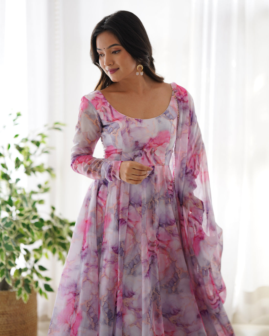 Anarkali Fabric: HEAVY PURE SOFT ORGANJA SILK PRINT Gown Flair: Approximately 4 meters flair attached...