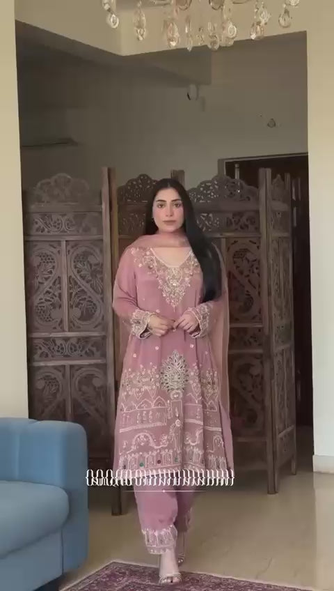 Step into graceful sophistication with this Exclusive 3-Piece Pant Set with Dupatta, crafted from premium French crepe fabric and adorned with delicate embroidery work. The stylish top paired with embroidered pants and a soft organza dupatta with lace border makes this outfit a versatile festive and party wear choice. 🌙💫