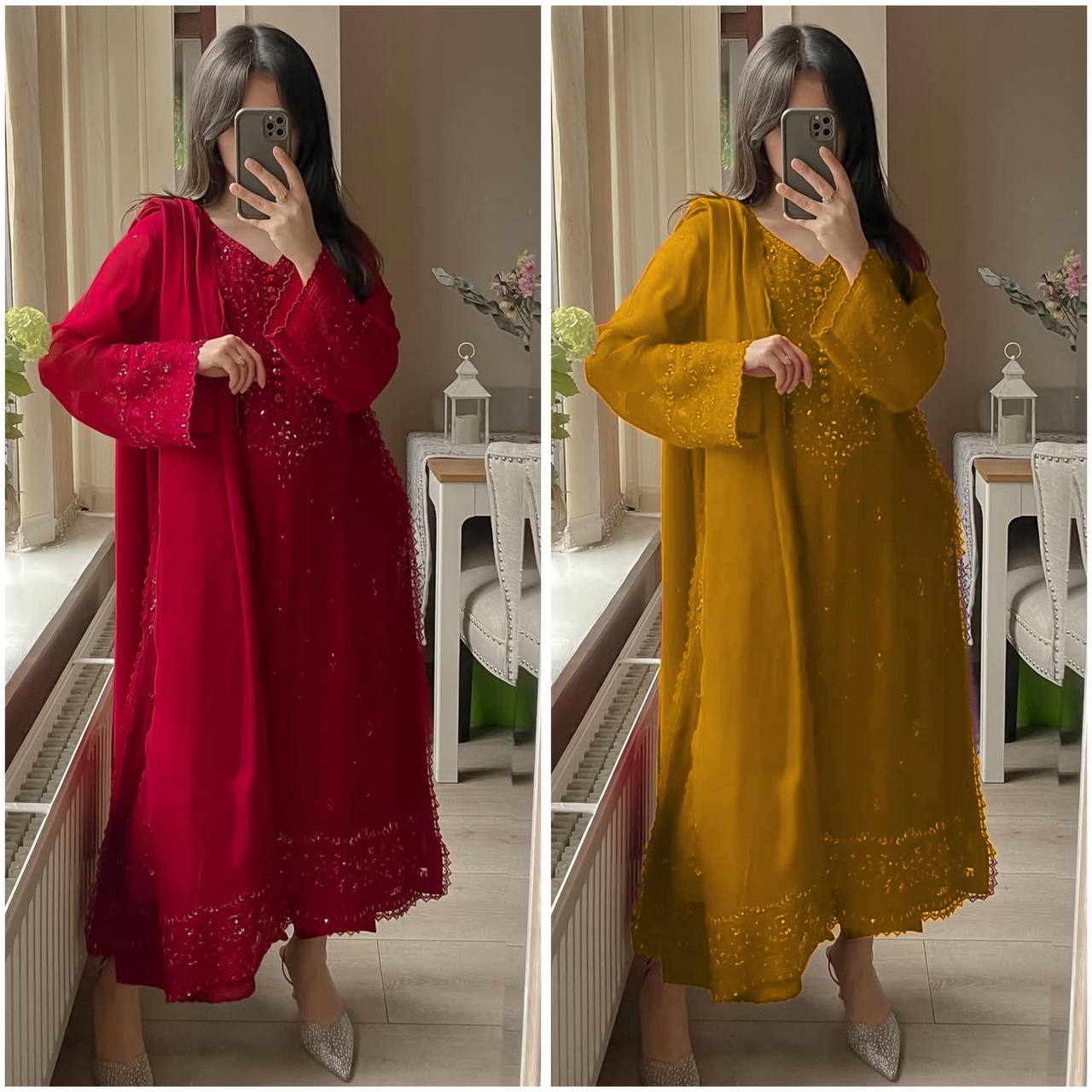 Step into elegance with this exclusive 3-piece plazzo set, designed in premium georgette with stunning sequence embroidery work. Perfect for weddings, festive occasions, and parties – this outfit blends comfort with luxury.