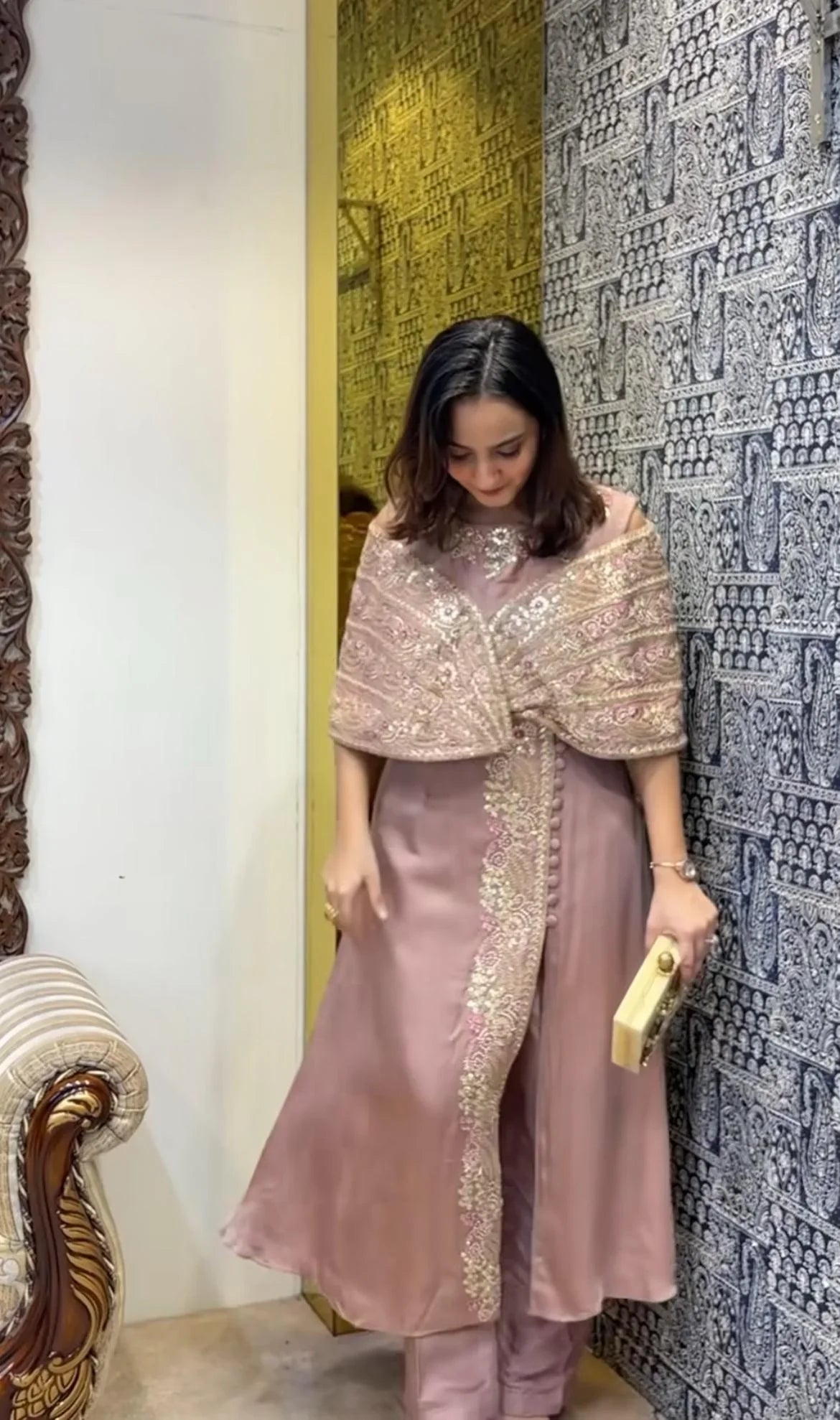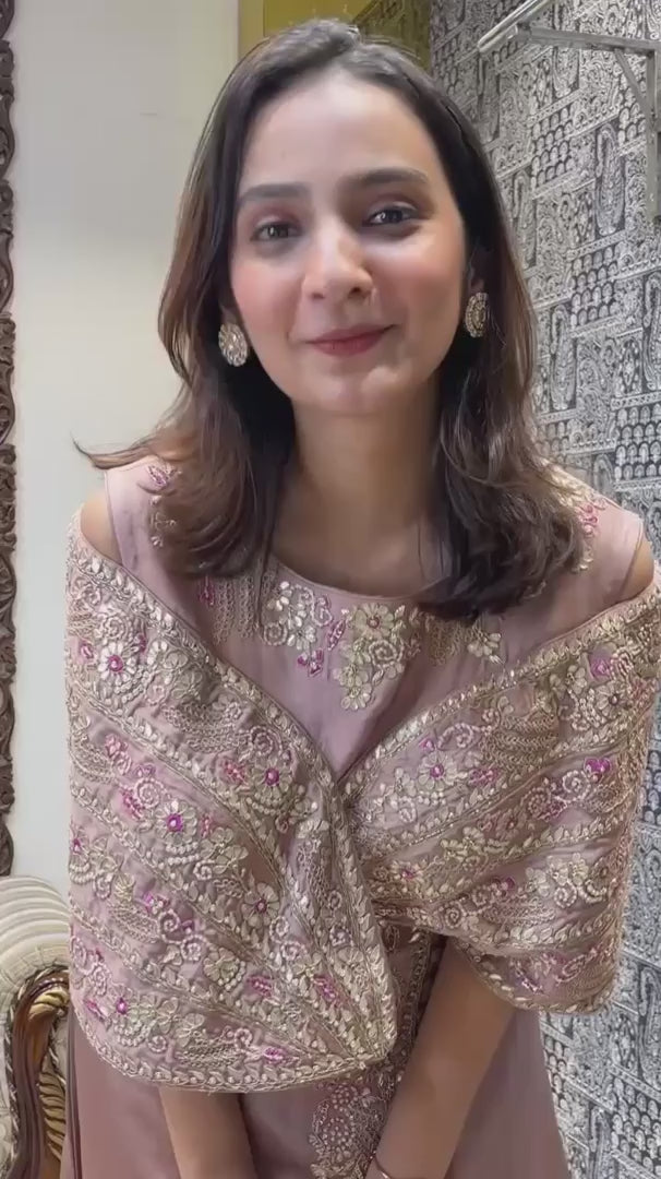 Step into spotlight-worthy elegance with this off-shoulder Crepe Silk gown paired with chic palazzo pants. Designed with exquisite cording sequence embroidery & foil paper work, it’s the perfect fusion of modern glam and traditional charm. Lightweight yet luxurious, this outfit ensures you shine at weddings, festive parties, and special occasions.